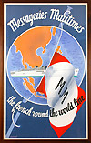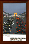 29  |  AFFICHE ANCIENNE D’ÉPOQUE, petit modèle avec au 1er plan 3 importantes barres à roue à l’arrière d’un paquebot arborant le pavillon français. En partie haute, carte du monde et des lignes des M.M. Inscrit : «Les Messageries Maritimes sur les routes de l’Union Française». Un modèle semblable au musée de la CCI de Marseille. En photo p.248 dans «La mer s’affiche». Parfait état. 39 x 57 cm. Encadrée, sous verre. Estimation :€ 280/350 |
