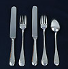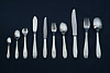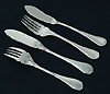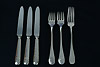 673  |  Ensemble de 5 pièces, orfèvrerie Christofle pour les 1ères classes comportant : 2 couteaux et 2 fourchettes de table ainsi qu’une cuillère. Modèle uniplat au monogramme circulaire et à l’argenture refaite par la Cie. Estimation :Les 5 pièces : € 150/180 |