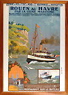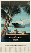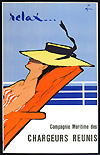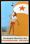 35  |  REPRÉSENTATION en couleurs pour les agences de la Cie montrant le paquebot sous grand pavois par tribord doublant une embarcation en bord de côte rocheuse d’après l’œuvre du peintre de la Marine, Roger CHAPELET. 45 x 63 cm. Encadrée, sous verre. Estimation :€ 230/280 |