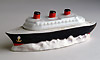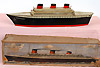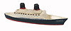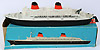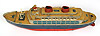 699  |  BATEAU JOUET en tôle représentant un paquebot à 2 cheminées peintes en couleurs et à l’emblème de la Cie (non identifié). Possède 4 roulettes sous la coque pour lui permettre d’avancer et tourner. Fabriqué au Japon par Modern Toys. L. 56 cm. Estimation :€ 250/350 |