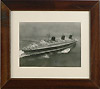 674  |  PHOTOGRAPHIE D’ÉPOQUE par Daireau et Bouché, photographes au Havre, 21 x 27.5 cm, contrecollée sur carton imprimé : LE HAVRE - Sortie du steamer «LA TOURAINE» de la C.G.T. La photo montre le paquebot mixte passant les digues nord et sud du port du Havre pour prendre la route de New York. Vu par 3/4 arrière bâbord avec personnages aux bastingages et sur les digues. 46 x 40 cm dans son encadrement d’origine. Très bon document d’époque. Estimation :€ 140/180 |